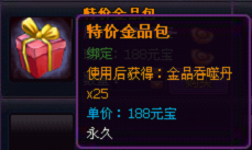 2、累计消费达到100不绑定元宝即可领取1个“消费100元宝礼包”;