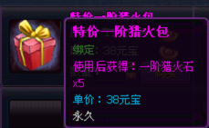 特价一阶猎火包:售价38元宝(原价110元宝)