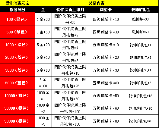 活动期间,玩家只要累计消费不绑定元宝达到(交易、市场、摆摊、百强争霸赛元宝流通,不计入本次累计消费元宝活动)100、500、1000、2000、3000、5000、10000、30000、50000不绑定元宝的玩家,系统会通过游戏内信件的方式发放奖励,届时请注意查收。