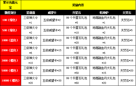 活动期间每天累计充值达到10000元宝,第2天即可获得包括“累计充值10000礼包”