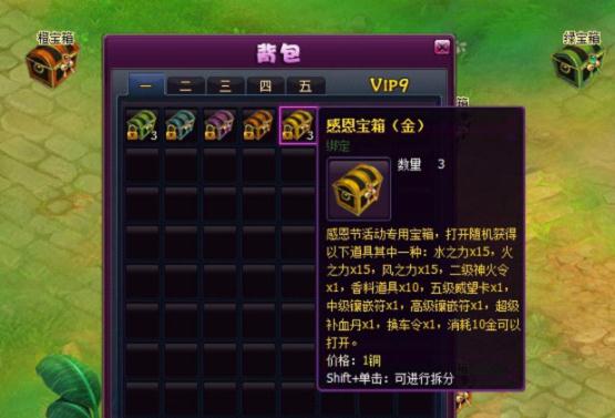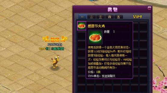 5. 感恩节火鸡(商城购买感恩节礼包可以开出)使用后获得一个金色火鸡变身状态,并获得1小时的打怪5倍经验buff,野外打怪时获得5倍经验,每人每天限使用一次,经验效果可以与经验符,vip经验加成相叠加