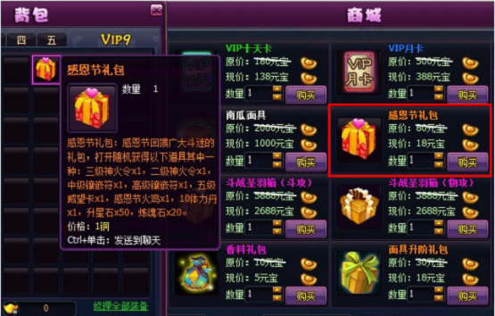 为了答谢广大斗迷长期以来对我们的支持,在感恩节活动期间,商城提别推出感恩节礼包,有几率可以开出各种贵重道具;