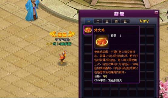 4. 宝箱所开出的所有物品都为绑定。集齐一定数量的香料道具,可以在兑换商城中兑换一个烤火鸡,点击使用获得一个褐红色的火鸡变身状态,并获得1小时的打怪2倍经验buff,野外打怪时获得2倍经验,每人每天只可以使用三次,可以与经验符,vip经验加成相叠加