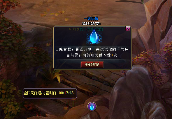 2. 天降甘霖的奖励如果未及时领取,次数可以被系统自动累计,但需要保持持续在线,若在有奖励未领取的情况下关闭页面,累计次数将清零,奖励也不可以被补领,请注意哦