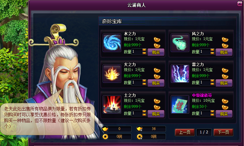 2. 本次云游商人将会出售一批道具,包括风之力,水之力,火之力,雷之力,土之力,中级镶嵌符,高级镶嵌符等。