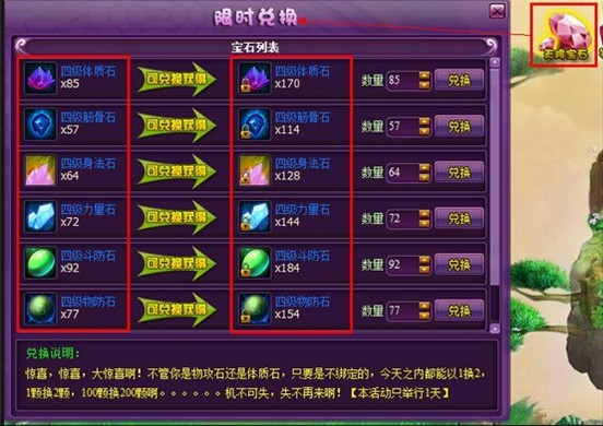 2、玩家背包内每1个不绑定的宝石,都可以免费兑换成2个绑定宝石;