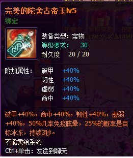 陀舍古帝玉:增加破甲,命中,韧性,虚弱抗性,有几率免疫眩晕,攻击中有几率使目标冰冻,持续3秒。(陷入冰冻状态的玩家,无法进行攻击,无法移动。)
