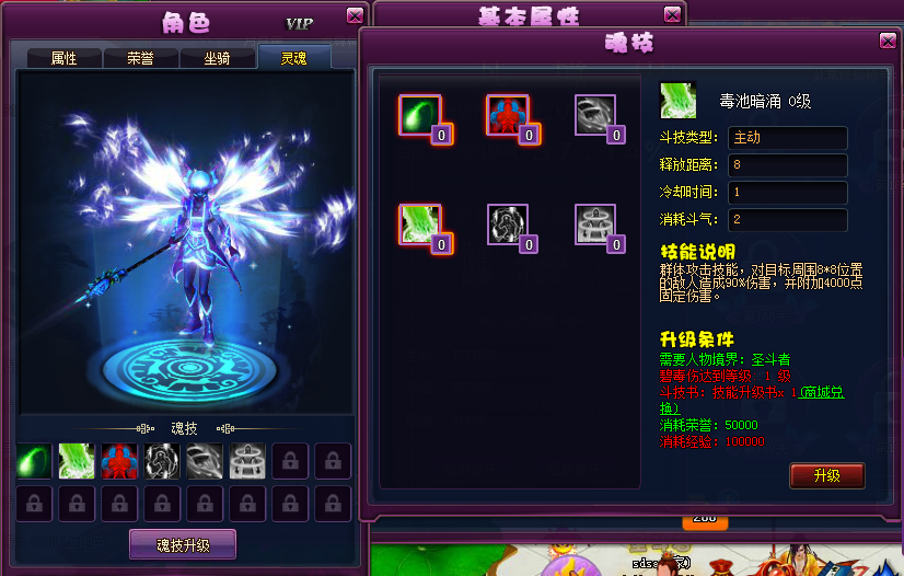 点击灵魂界面的“魂技升级”按钮,可以进入魂技升级界面。