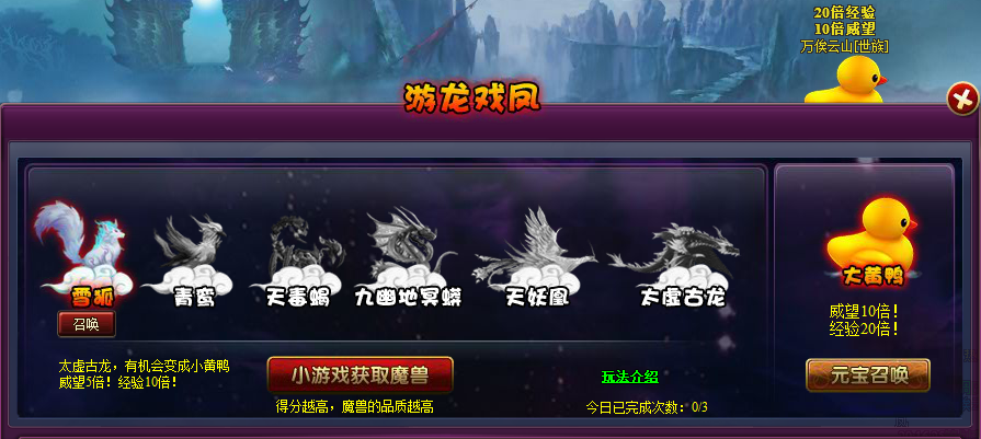 活动期间,玩家在游龙戏凤中召唤召唤兽时,将有几率召唤出特殊召唤兽暑船—大黄鸭。