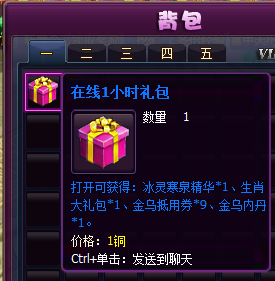 2. 在线礼包可开出冰灵寒泉精华,勋章,金乌内丹及金乌抵用券等道具