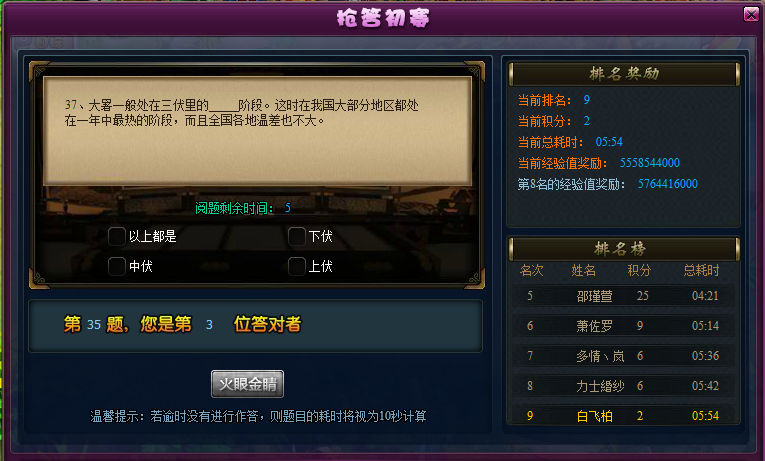 每答对一道题都可以获得大量的经验,答错则只获得70%的经验,前十名答对题目的玩家视为抢答成功,可以获得双倍的经验奖励