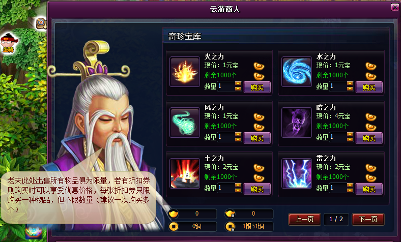 4. 云游商人处可以使用折扣券,对购买的物品进行打折哦,每张折扣券只限购买一种物品,但不限数量(建议一次购买多个)