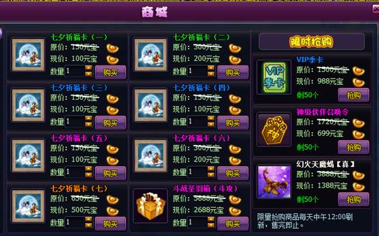 凑齐七种祈福卡片可以在帝都活动大使npc处兑换指定的牛郎,织女伙伴变身符(有效时间持续30天)
