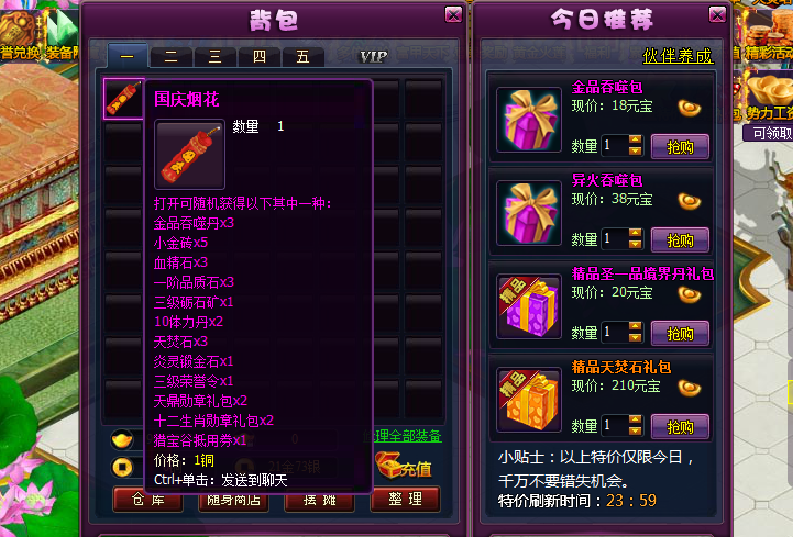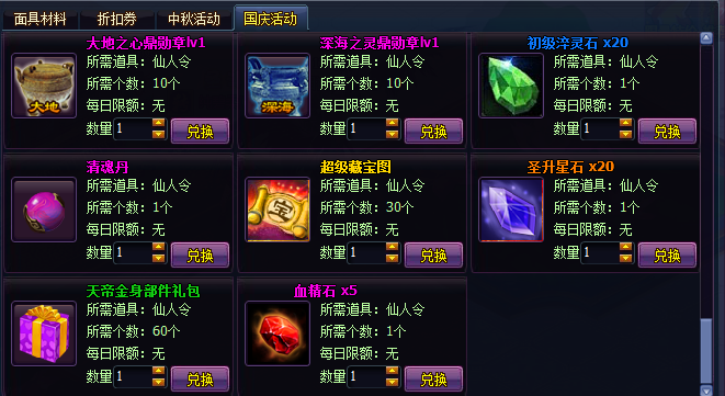 活动期间,玩家每天登陆游戏可以在帝都活动大使npc处领取一个国庆登陆礼包奖励,可以开出钱币,绑定元宝,许愿石,天焚石