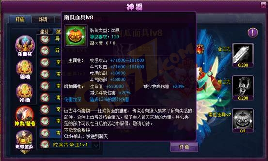 版本更后,南瓜面具开启LV8打造,打造需要光之力,木之力,雷之力,金之力,暗之力,南瓜面具LV7