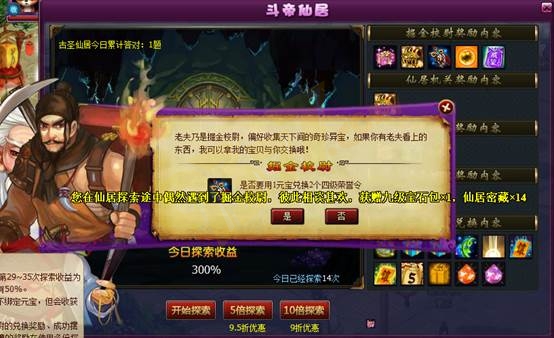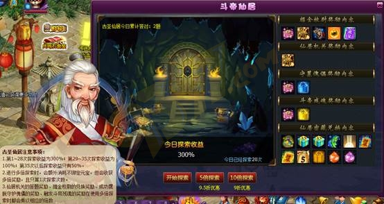 活动期间,点击界面上的古圣仙居图标,可进入选择界面,选择一个仙居后可以进行探索,探索次数越多,收益会逐渐递减,若使用多倍探索,则只算一次探索次数,但可获得多倍奖励