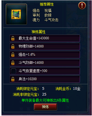 l 每件装备最多获得6个神炼属性,最少为2个,在达到最大以及最小值前,每次神炼都有可能增加或减少一个神炼属性。