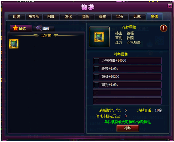 (1) 只有进行装备神炼之后才可以进行魂炼。