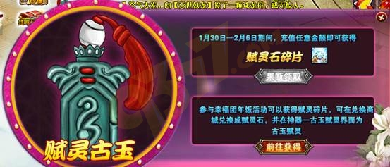 活动期间,玩家只要充值任意元宝,即可在界面中领取12个赋灵碎片(绑定)