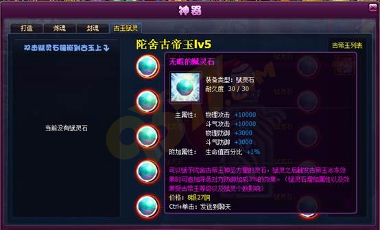 赋灵石可以在神器界面对陀舍古帝玉进行赋灵,为陀舍古帝玉的冰冻技能增加一个可以叠加的降低对方防御加成的效果,最高可降低对方75%的防御加成