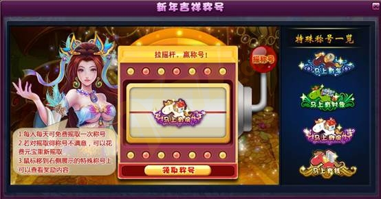 1、活动期间,玩家每天登陆游戏可以在点击【摇称号】图标,打开界面摇取称号,每人每天有一次免费摇取称号的机会,如果对摇到的称号不满意,想重新再摇则需要消耗元宝