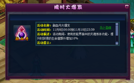 活动期间,吞噬天魂融血丹和地魂融血丹时,提升的血量额外增加10%