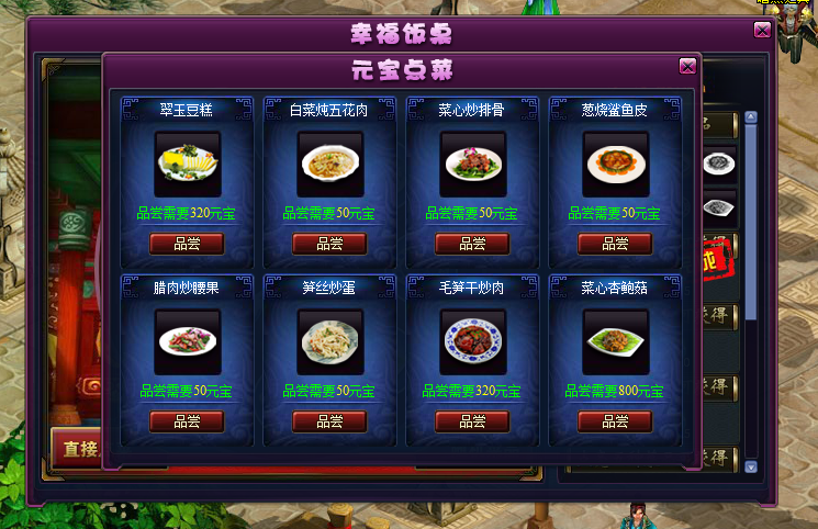 消耗不绑定元宝点击[随机菜品]按钮可以随机选菜,品尝菜品获得奖励,每种菜品都对应不同的奖励。