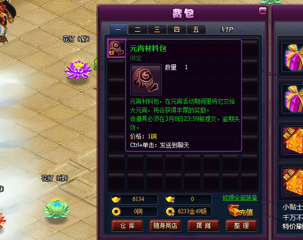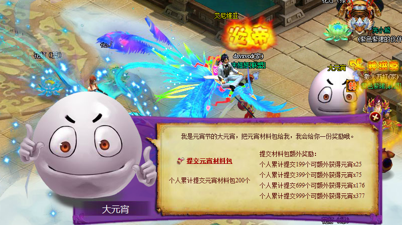 活动期间内,可以将获得的元宵材料包提交给帝都的大元宵NPC,获得元宵奖励,累计提交达到一定的数量可以获得额外奖励,提交数量会在第二天重置。