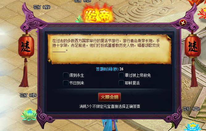 活动期间内,每天指定时间会在各势力帝都刷新一批花灯,可以点击花灯进行答题,获得元宵材料包奖励。