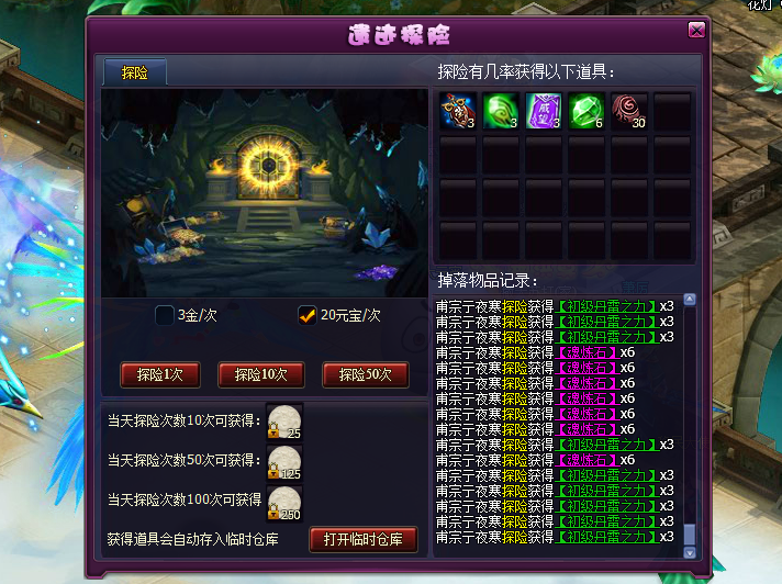 可使用金币、元宝两种形式进行探险,每天探险达到一定的次数可获得额外奖励,奖励会直接存入临时仓库中。