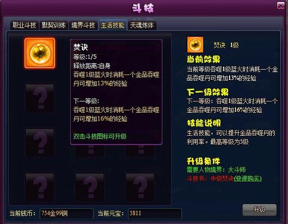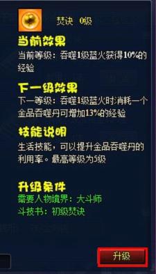 1、 焚诀初始等级为0级,满足下一级别升级条件后才可升级,升级技能需要满足两个条件(人物境界和相应的斗技书)。