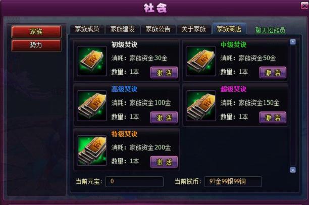 2、 斗技书—【焚诀】书的获得方式:点击【快速购买】或者使用快捷键“O”,打开【社会】中的【家族商店】,可以看到初级、中级、高级、超级、特级的焚诀。