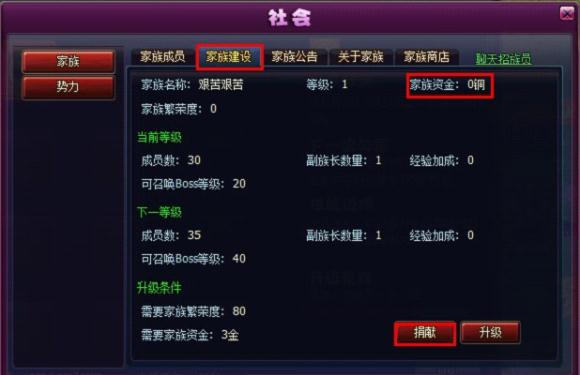 3、 购买【焚诀】书之前需要使用家族钱币来激活。家族资金的多或少,可以在【家族建设】界面查看家族资金,如果家族钱币不够,家族玩家可以打开【捐献】功能项,捐献钱币或者捐献元宝(1元宝等于10银)。