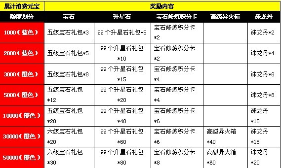天焚石,高级异火,升星石,诛龙丹,高级宝石等等,件件是宝贝,消费一定金额就能得到它们。各位还在等什么呢,赶快行动吧。