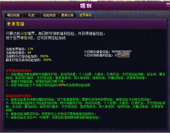 2) 世界等级越高,获得的福利经验及储备经验也越高。