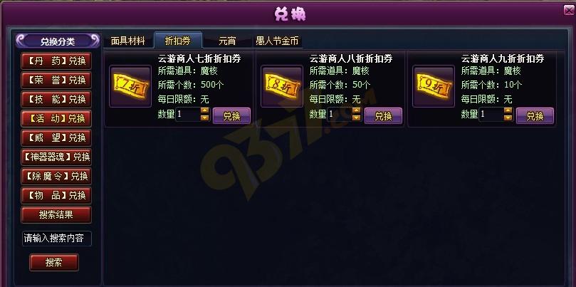 2. 击杀副本内怪物有几率得到魔核,收集一定量的魔核可以在兑换商城处兑换折扣券,在云游商人处购买物品时使用折扣券可以享受优惠价格