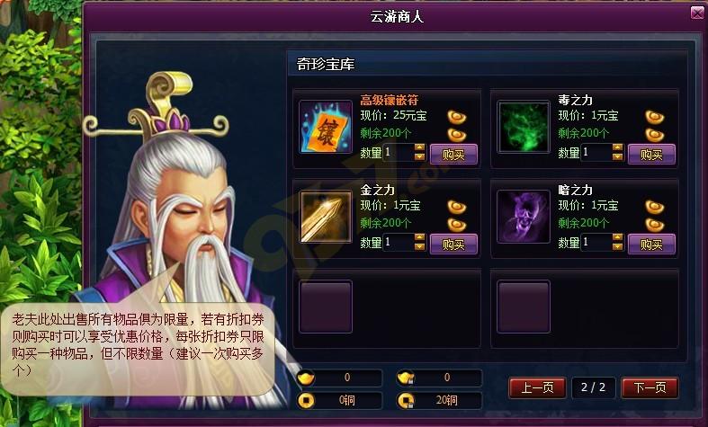2. 本次云游商人将会出售一批道具,包括毒之力,暗之力,金之力,雷之力,土之力,中级镶嵌符,高级镶嵌符等。