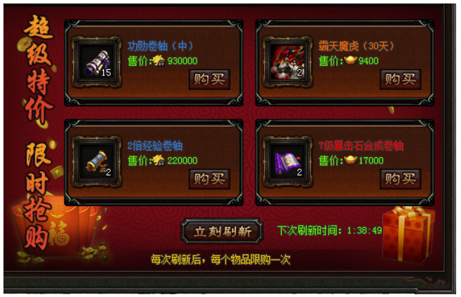 活动期间在神秘商店中会刷出众多低价极品道具,更有非商城出售道具出现。超低折扣,买多赚多