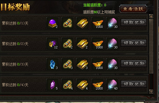 活动期间玩家每日活跃达目标,即可领取相应的奖励。累计达成活跃4天即可领取全部奖励。