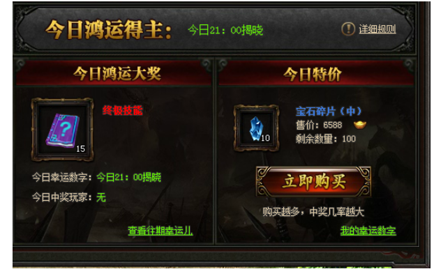 活动期间玩家可购买超低折扣道具,购买道具即可获得一个随机数字。每天晚上21:00系统将开出幸运数字。拥有该数字的玩家将获得幸运大奖!