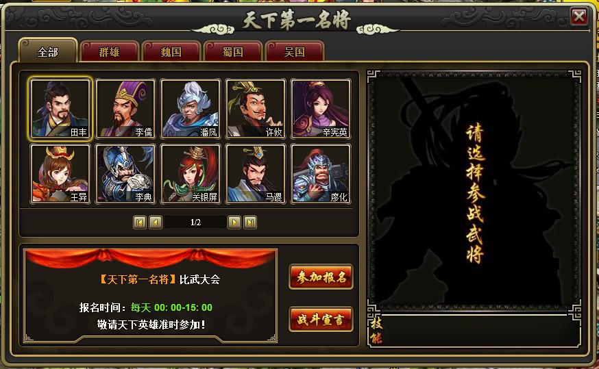 玩家自列表中选择参赛武将后点击【参加报名】按钮,即可完成参赛操作。