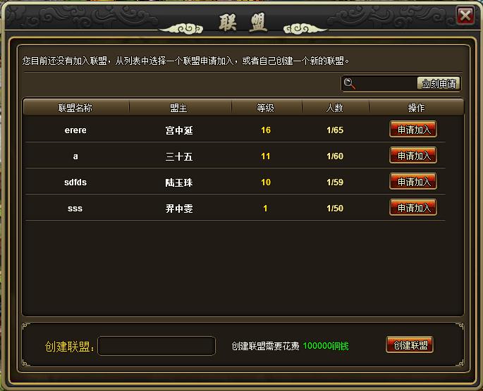 开启联盟系统时,玩家会见到各个推荐联盟的列表;玩家可以通过申请加入联盟,或者自己创建联盟加入;