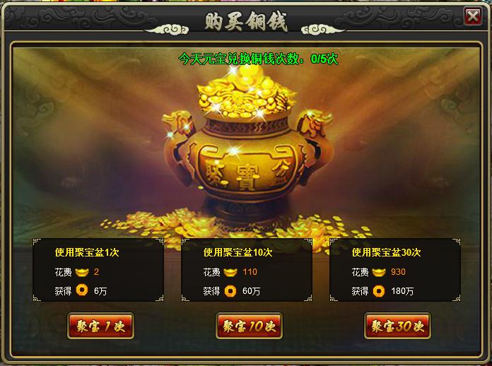 聚宝盆在游戏中的通俗意思就是利用元宝兑换铜钱的功能。