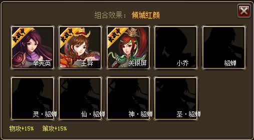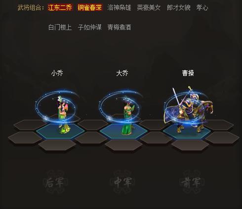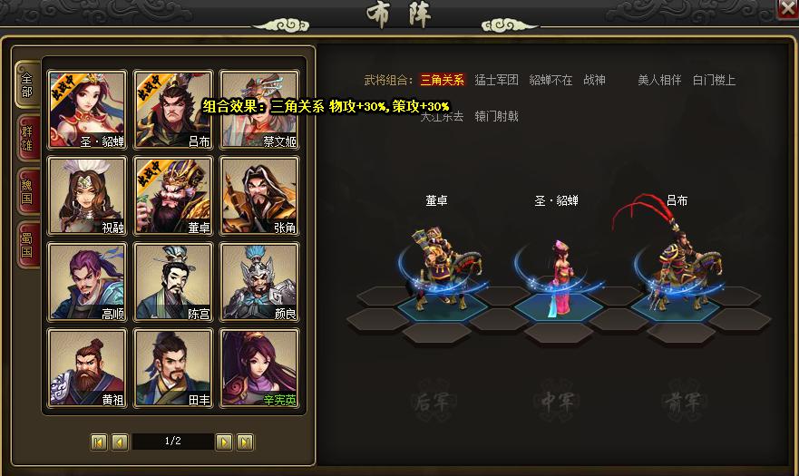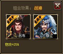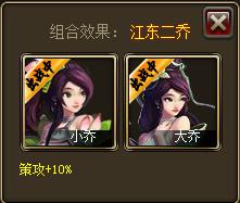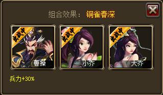 注意右侧闪亮的光效和组合效果提示文字——在游戏中,安排特定的将领出战,会得到强力的组合效果。