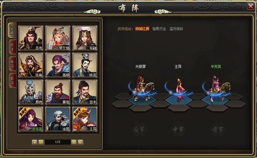 前列最先承受敌人的攻击,因此需要派出防御力高、血多的将领。