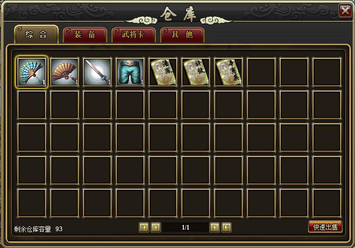 仓库内可以看到玩家除了已穿戴的装备外其余所有物品,玩家可以对单独一项物品进行展示或出售,也可以选择快速出售后通过点击多项物品进行出售;
