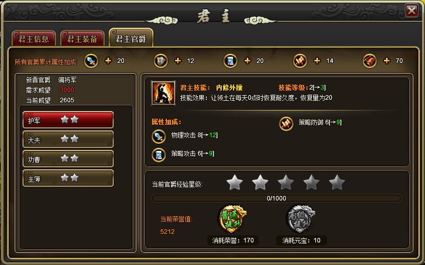 2) 荣誉:玩家通过获取荣誉,从而提高已有官阶的品质;