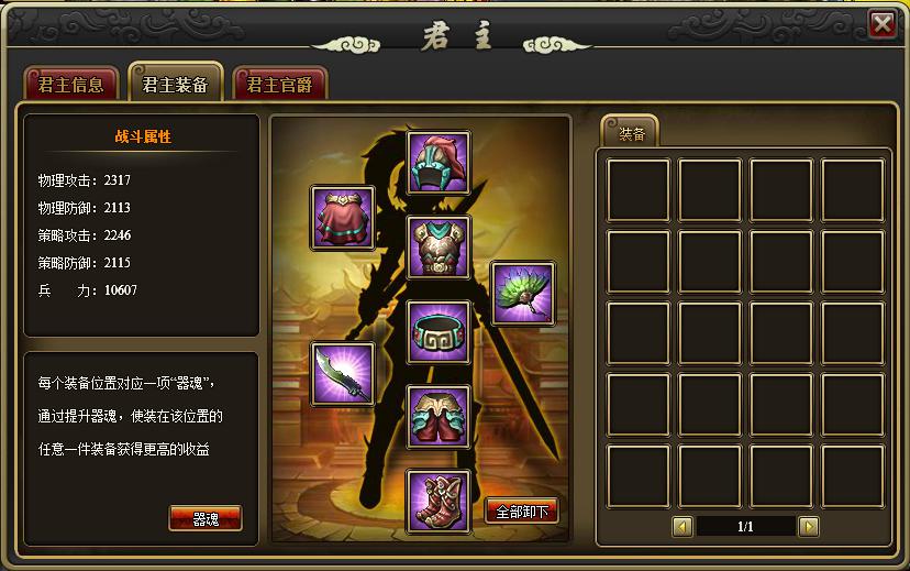 君主装备:君主装备是玩家直接强化战斗将领的一种方式,玩家将其获得的装备装备到君主身上,然后其对应的加成值会累加到玩家所带领的将领上;