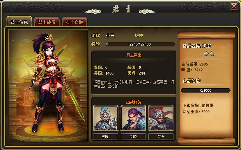 君主主要有君主装备与君主官爵,前者影响玩家所有将领,后者不仅影响战斗,同时还会给予玩家某些君主技能。