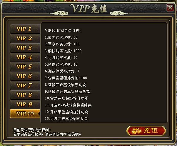 | 10 | 您现在是VIP10玩家 | 1.购买军令体力铜钱次数+1 2.购买讨贼次数+2 3.购买酒馆任务次数+3 4.购买将领训练位+3 5.聚宝盆使用次数600 6.仓库容量+50 7.联盟城池冲锋陷阵冷却时间为0(无需冷却) |